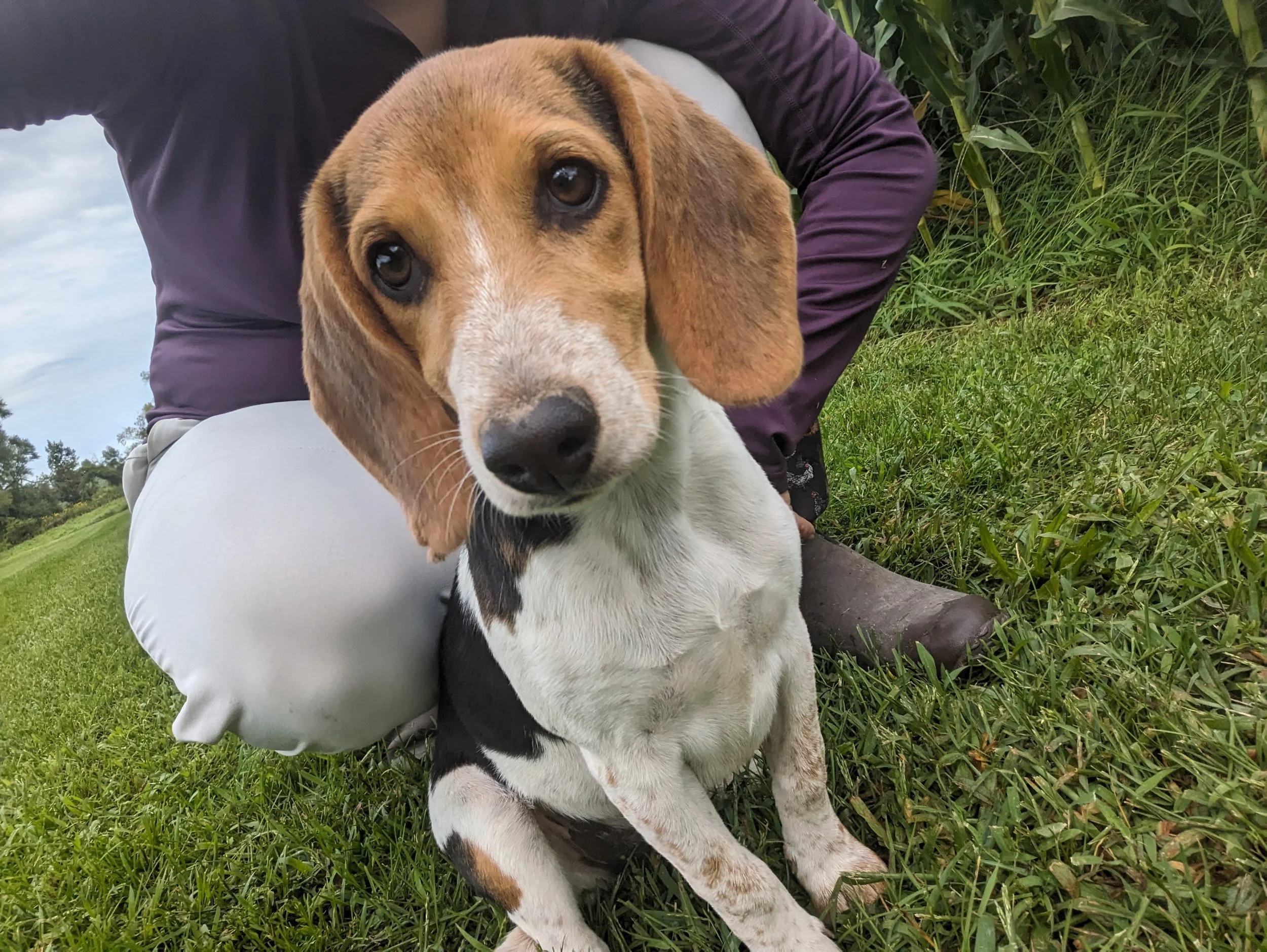 When she's not busy caring for her little ones, Bonnie is an absolute explorer! She has a deep love for our farm, eagerly joining us for runs through the open fields and adventures into the woods. Her Beagle nose is always to the ground, and she has a natural instinct for the hunt, particularly enjoying chasing after rabbits.