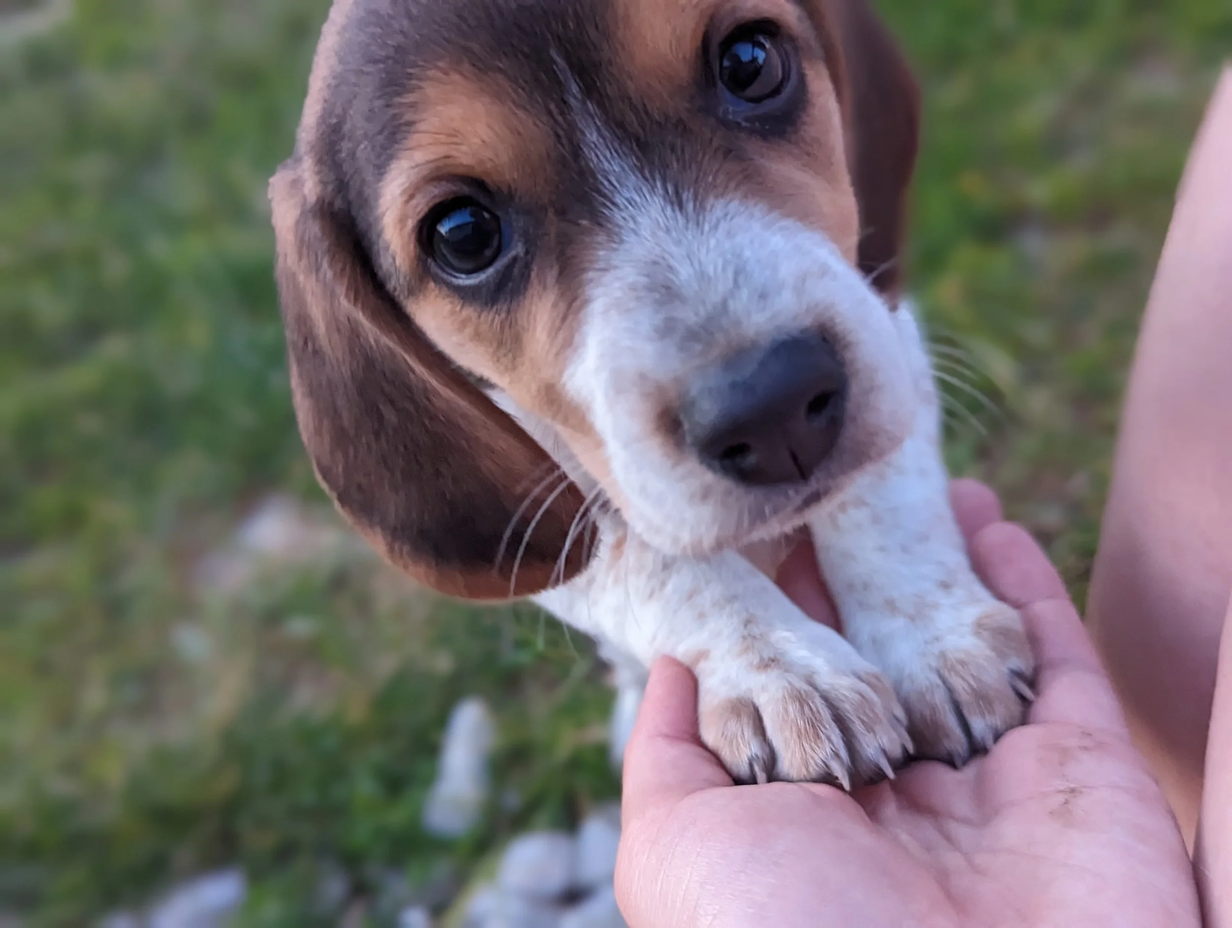 Meet Huck, the handsome patriarch of our Beagle crew! This stunning tri-color Beagle embodies everything wonderful about the breed. He's not just beautiful to look at; Huck is a vibrant and energetic boy who brings endless fun and a whole lot of sweetness to our farm.