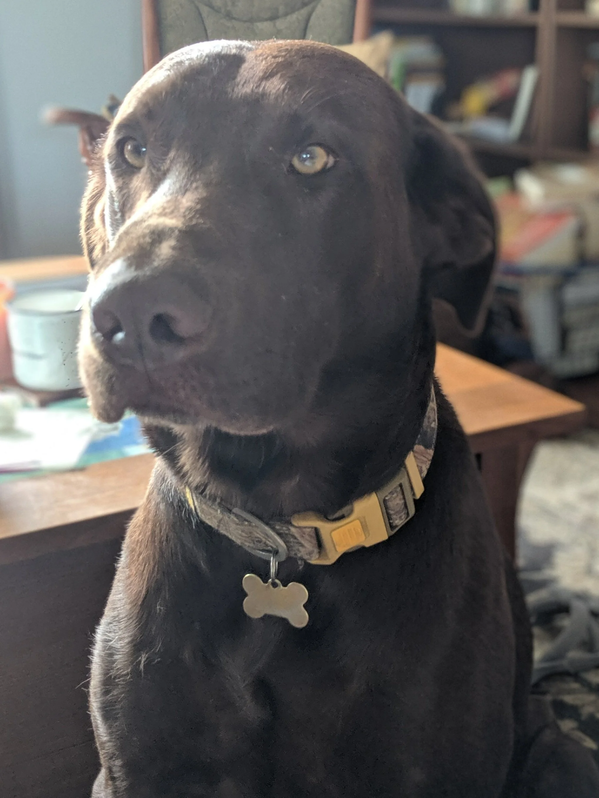 Moses averages 95 lbs with a dark chocolate coat. He is an AKC-certified Purebred American Chocolate Labrador Retriever. His elbows and hips have all been evaluated and certified by the Orthopedic Foundation for Animals (OFA) to preclude hereditary joint problems like hip dysplasia.